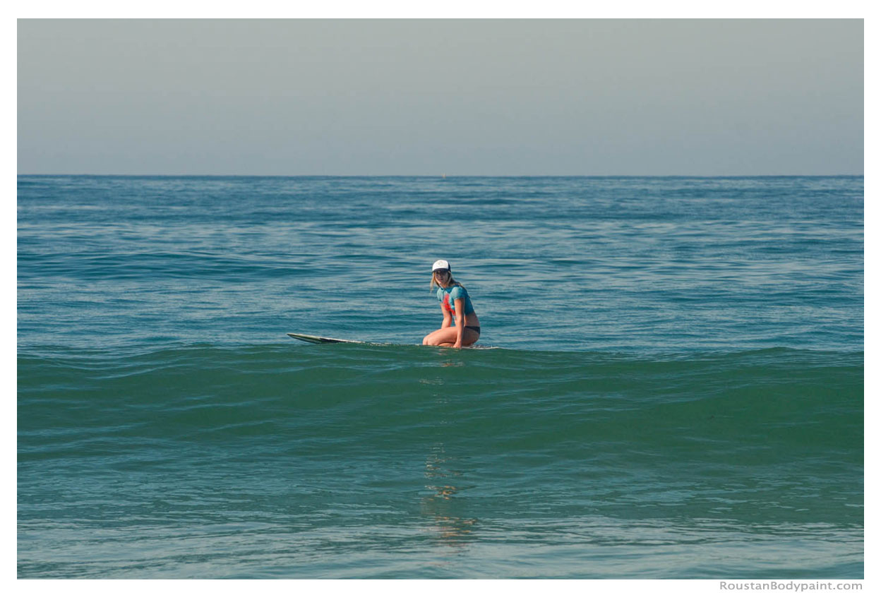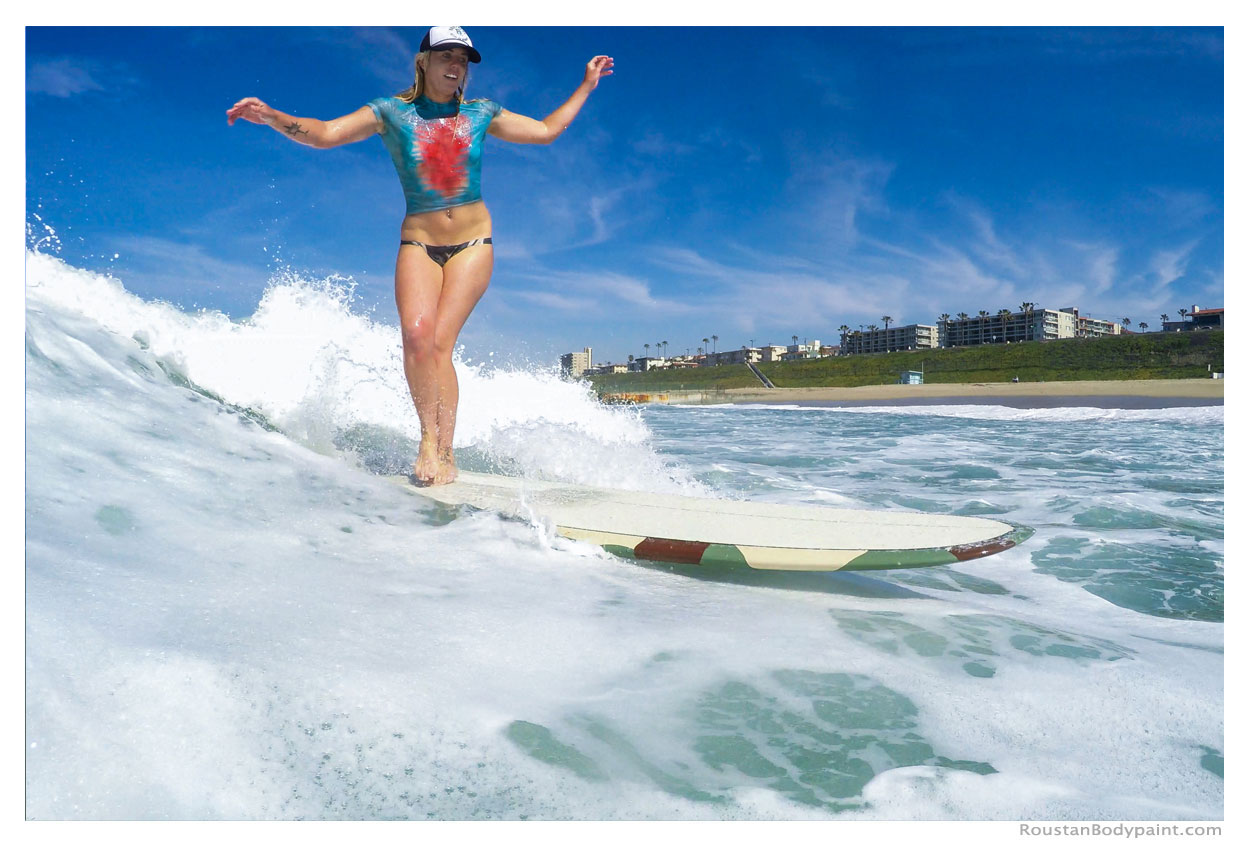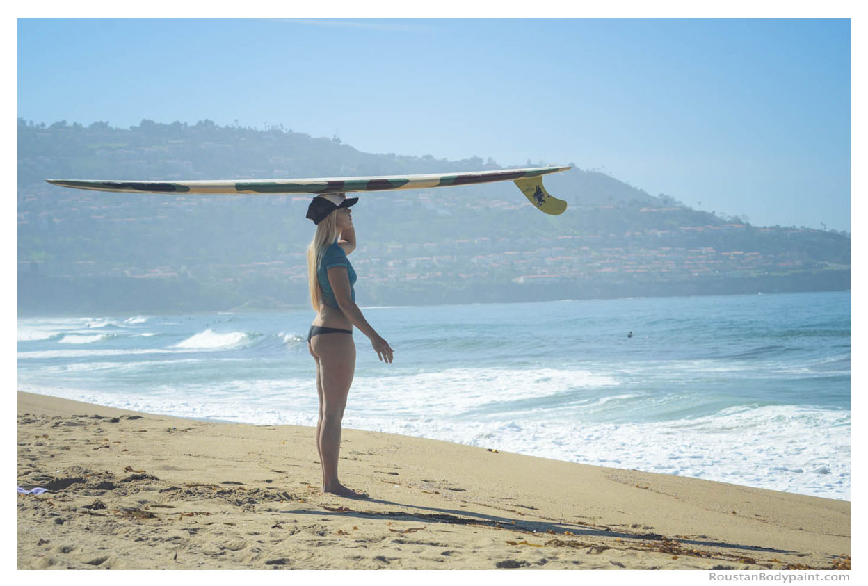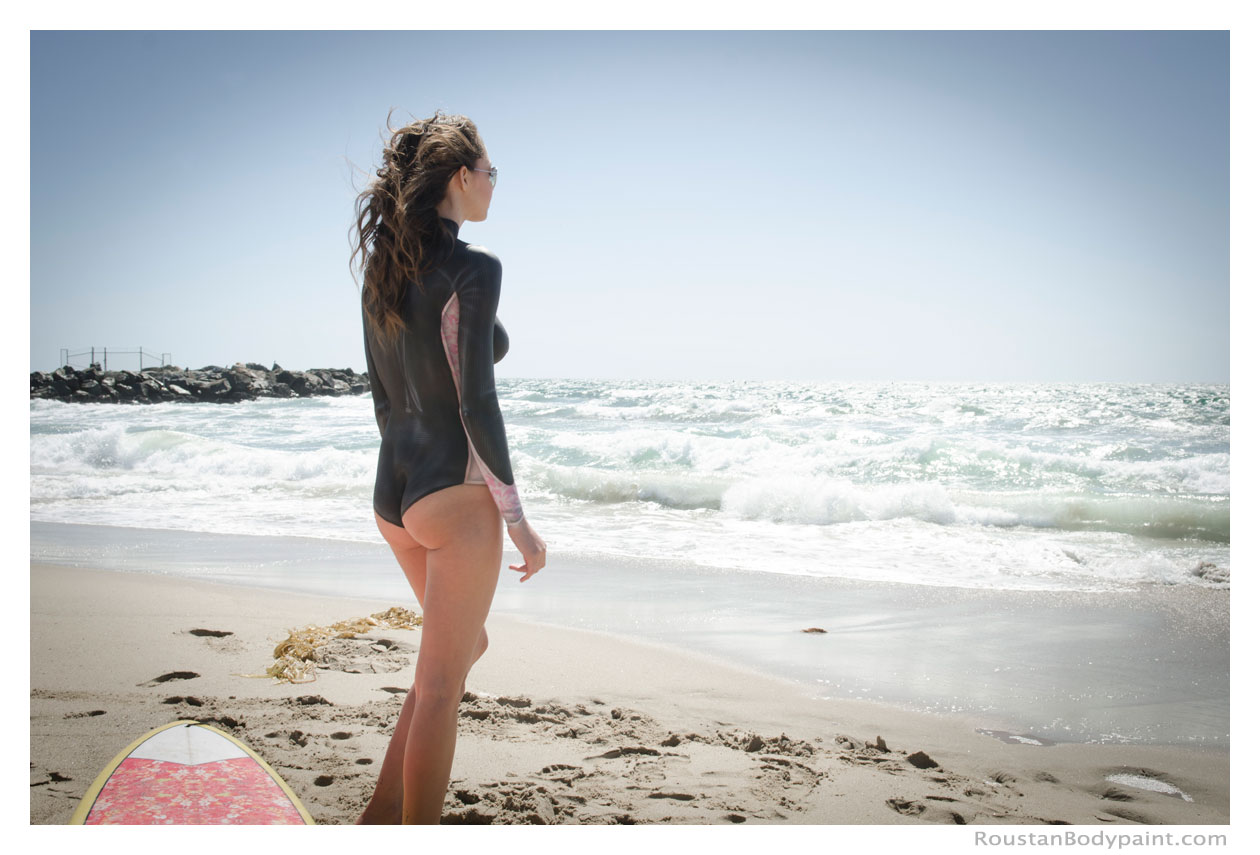 These 4 surfer gals look like they're wearing wetsuits, but look again! They're actually wearing pasties, strapless thongs, and body paint!