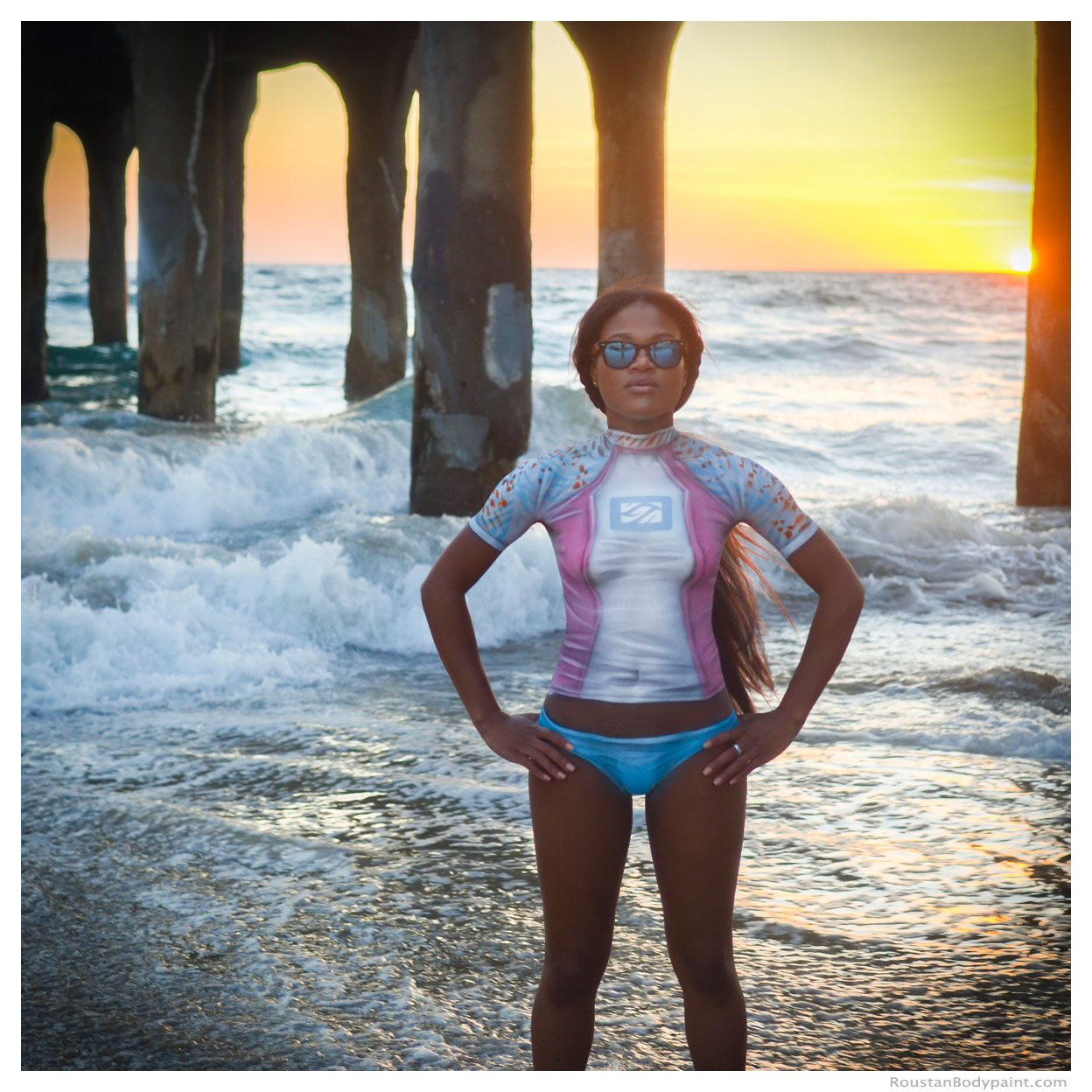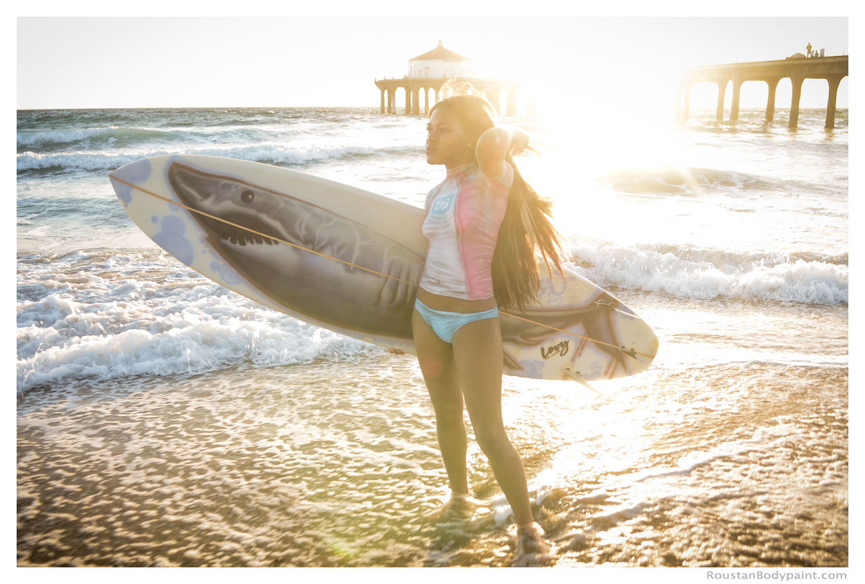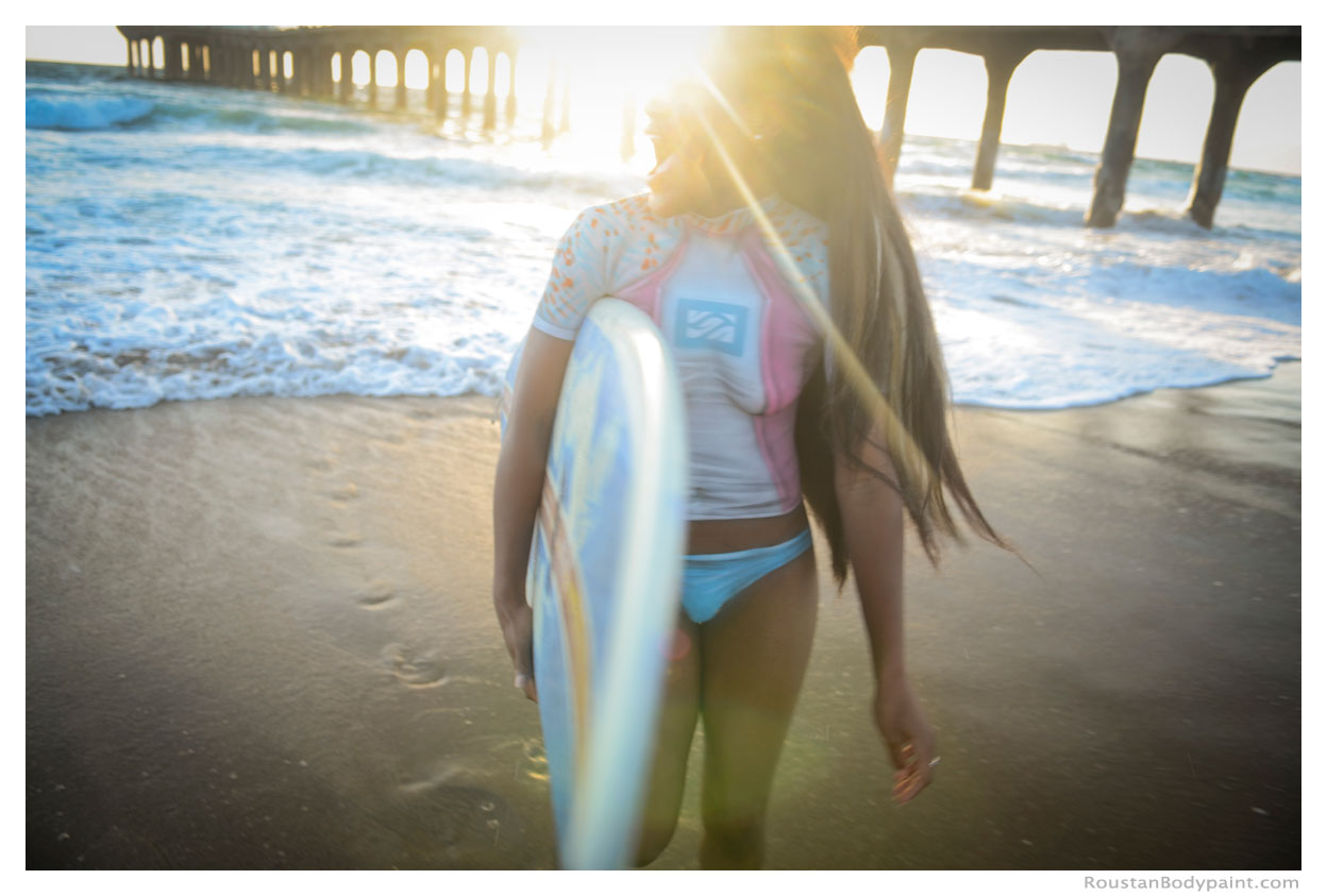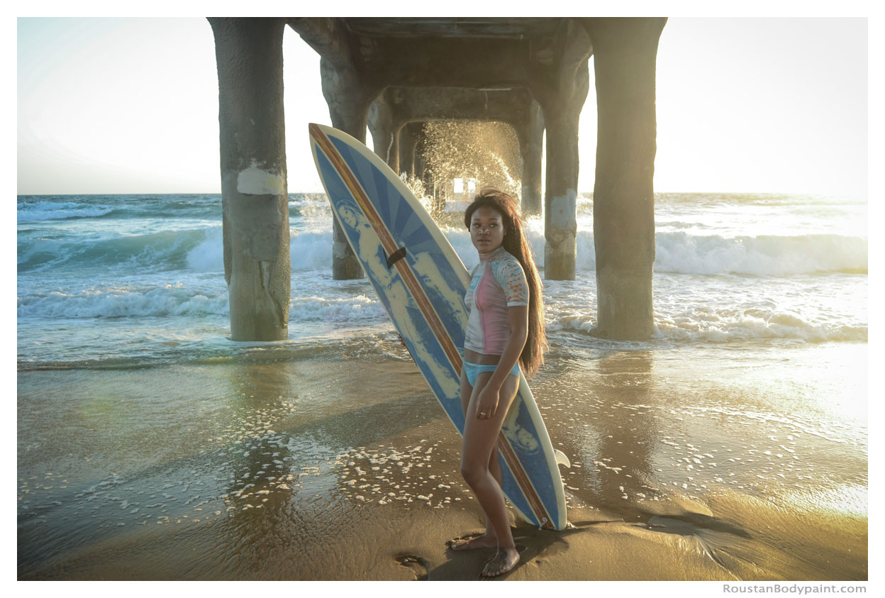 These 4 surfer gals look like they're wearing wetsuits, but look again! They're actually wearing pasties, strapless thongs, and body paint!