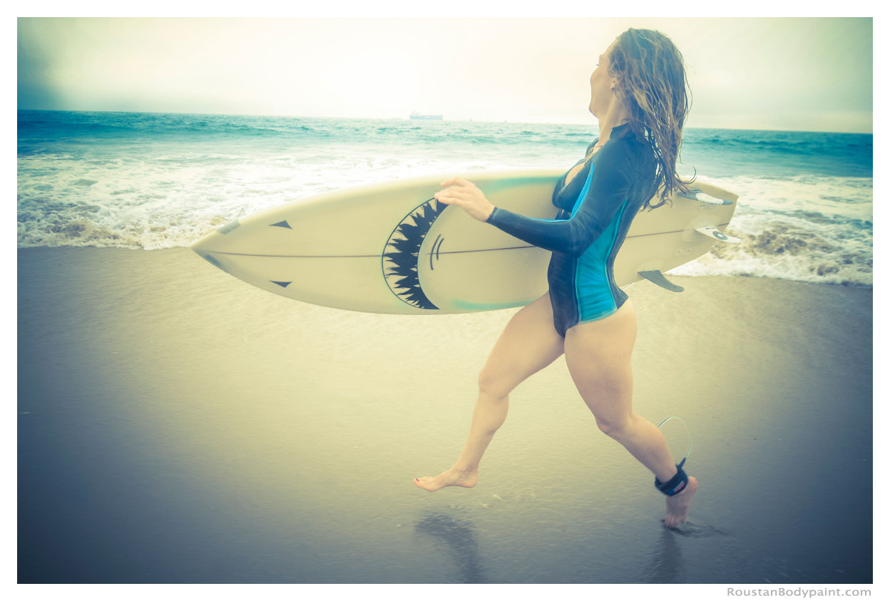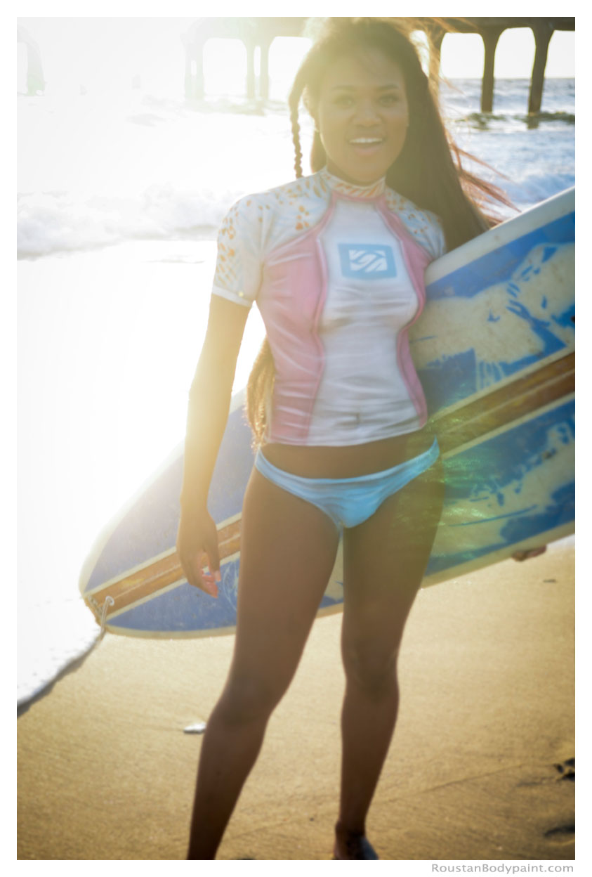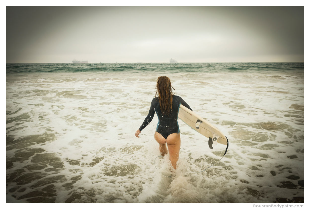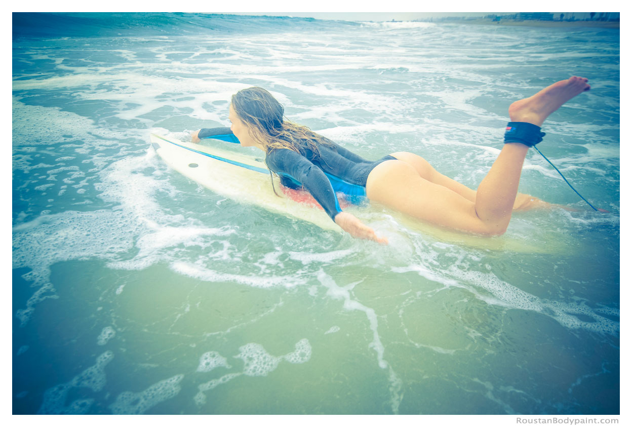 These 4 surfer gals look like they're wearing wetsuits, but look again! They're actually wearing pasties, strapless thongs, and body paint!