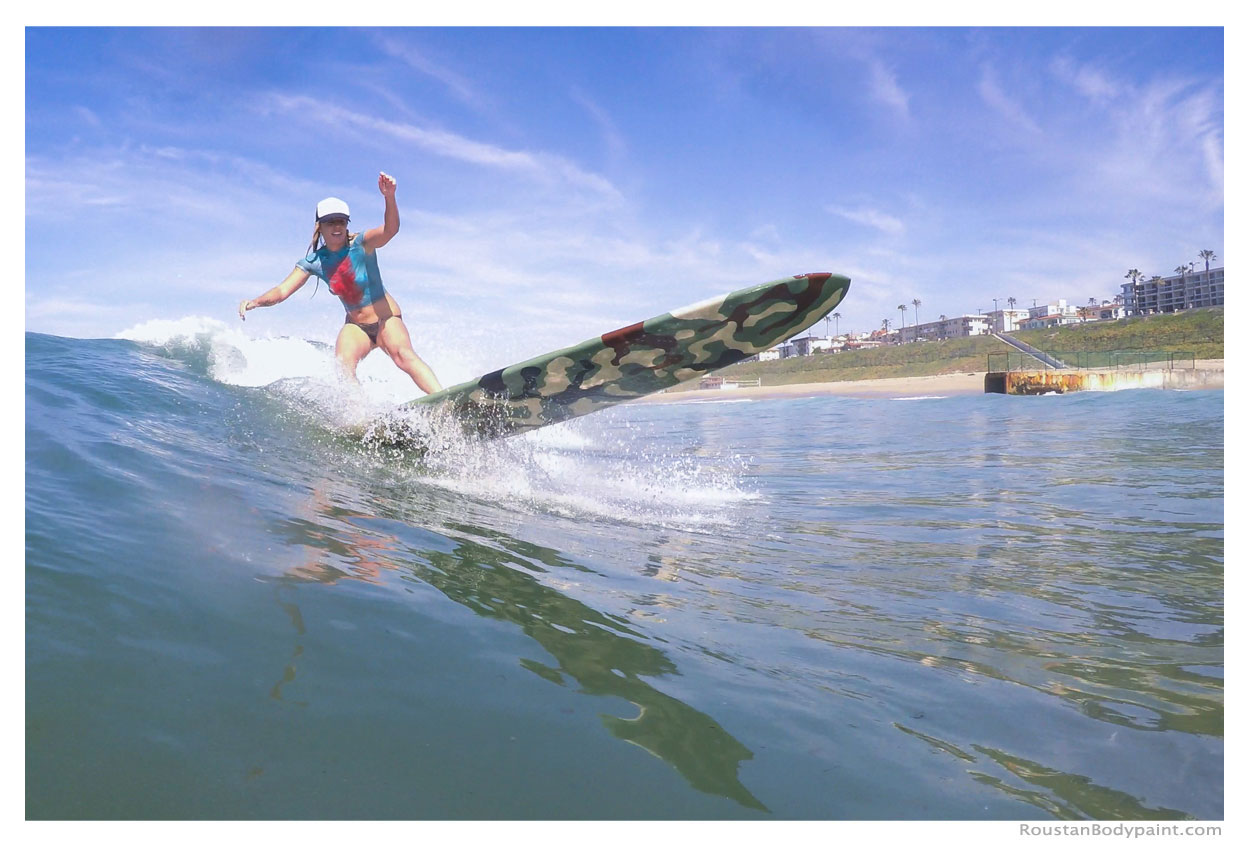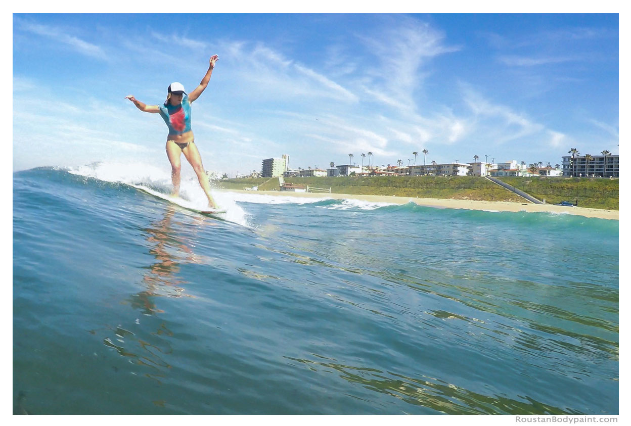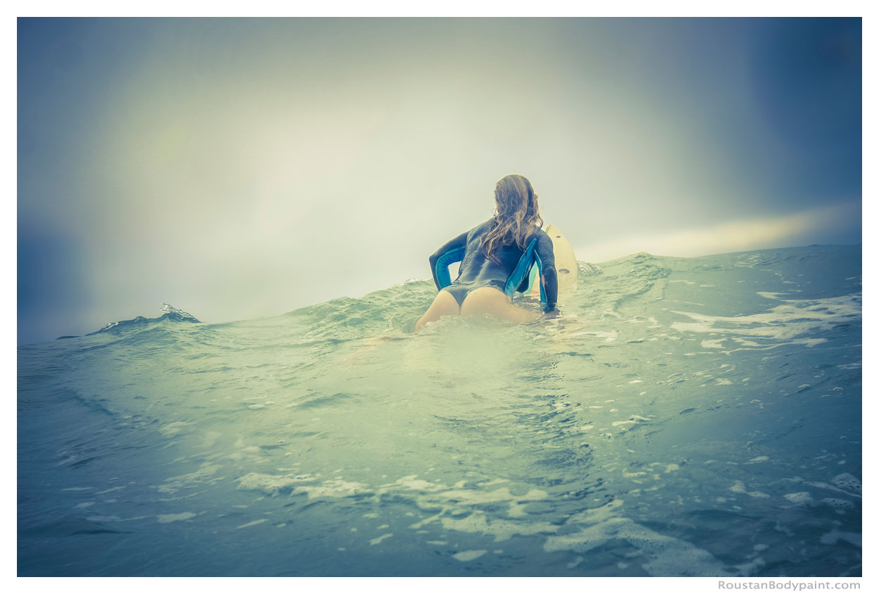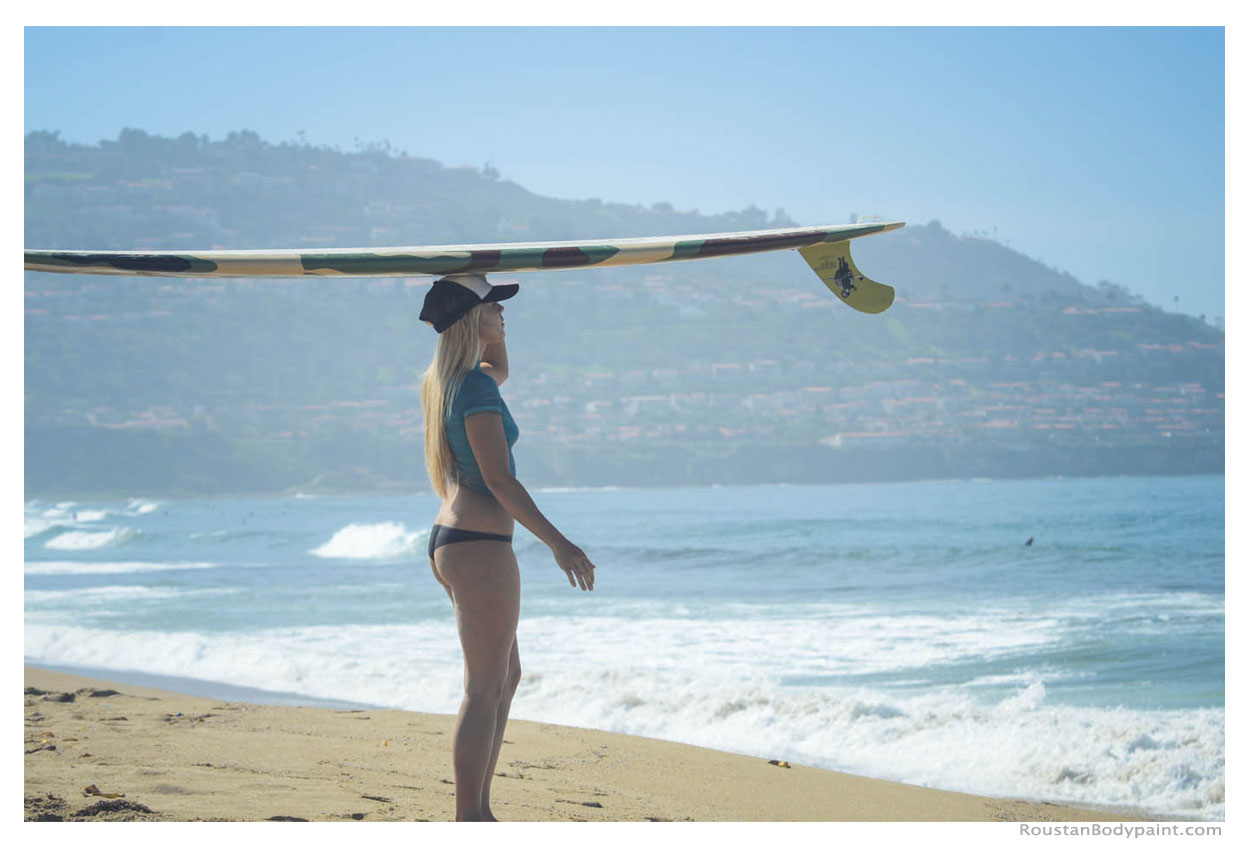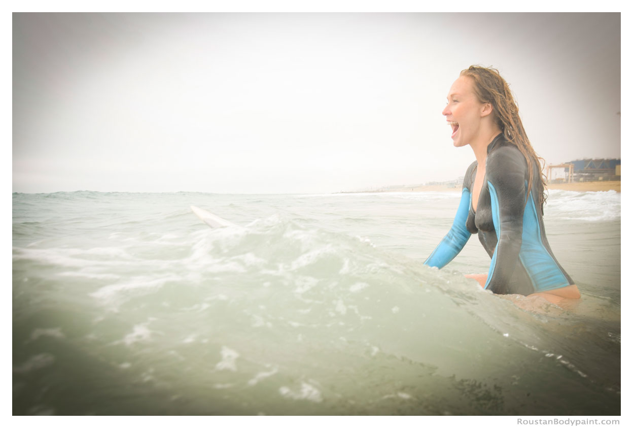 These 4 surfer gals look like they're wearing wetsuits, but look again! They're actually wearing pasties, strapless thongs, and body paint!